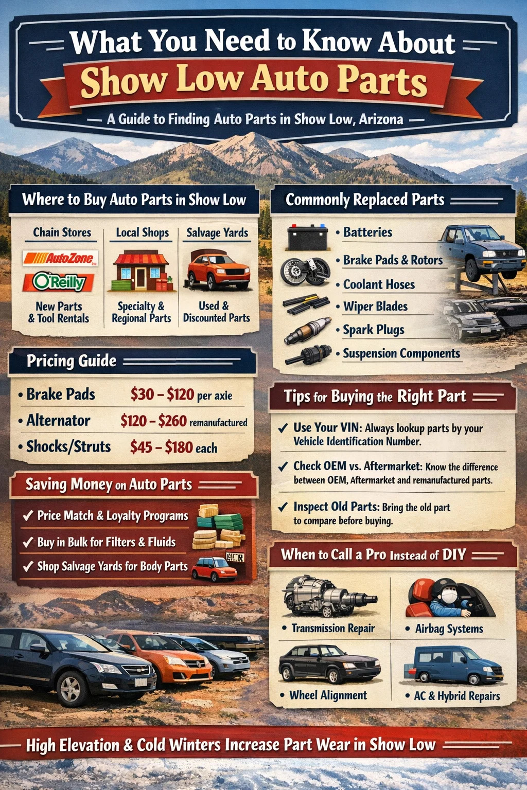 إن Show Low ليست منطقة مترو رئيسية، ولكنها تحتوي على خيارات إمداد كافية للتعامل مع معظم احتياجات الإصلاح دون انتظار أيام للشحن. يساعدك فهم الفرق بين هذه المنافذ على اتخاذ قرارات أسرع وأكثر ذكاءً عندما تكون سيارتك معطلة.