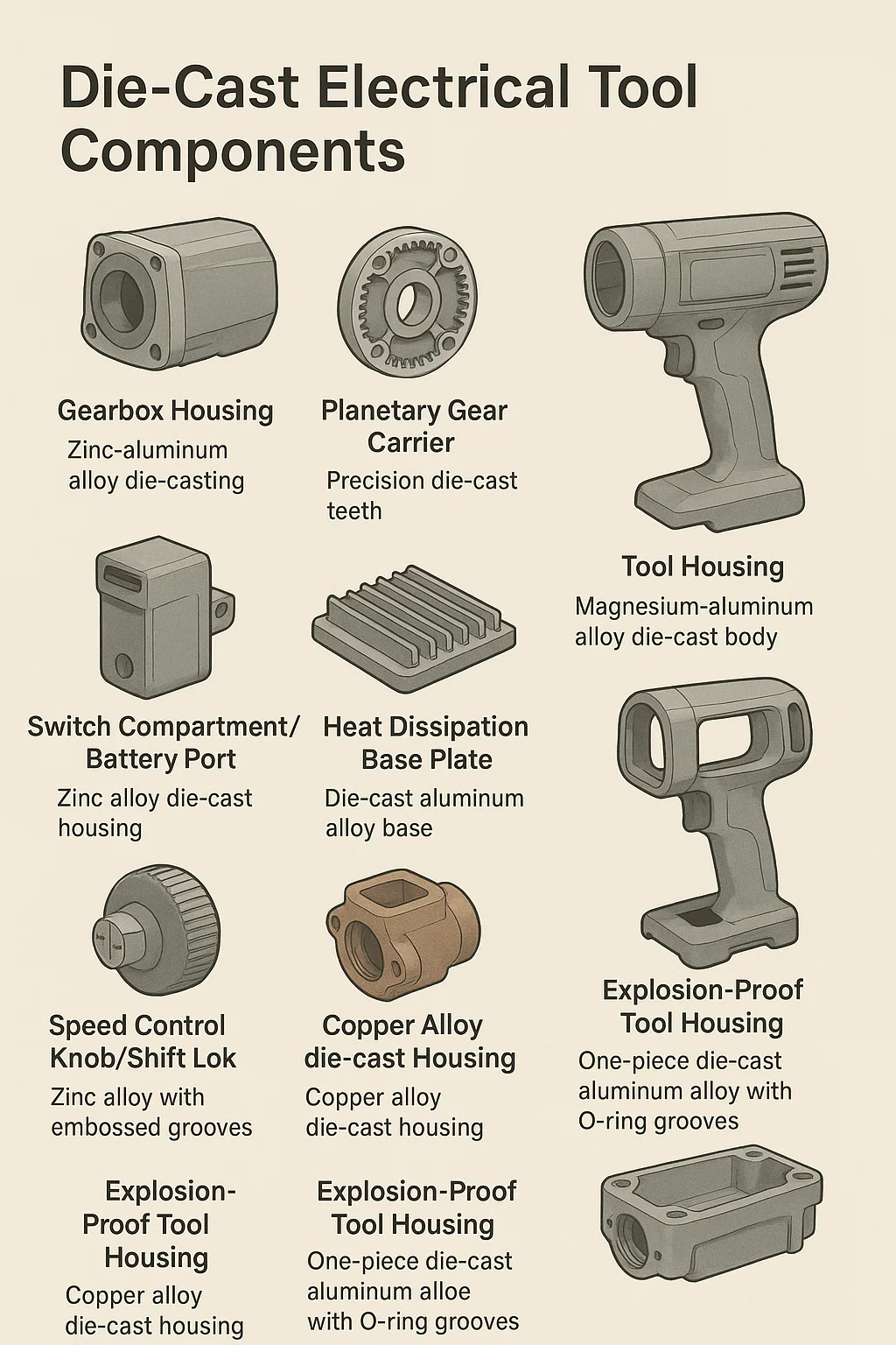 تشير مكونات الأدوات الكهربائية المصبوبة إلى الأجزاء المعدنية الأساسية المصنعة من خلال عملية الصب بالضغط العالي. إنها تعالج نقاط الألم الرئيسية للأدوات الكهربائية، مثل التأثير العالي، وتبديد الحرارة، والسلامة الكهربائية. التطبيقات والميزات الرئيسية هي كما يلي: