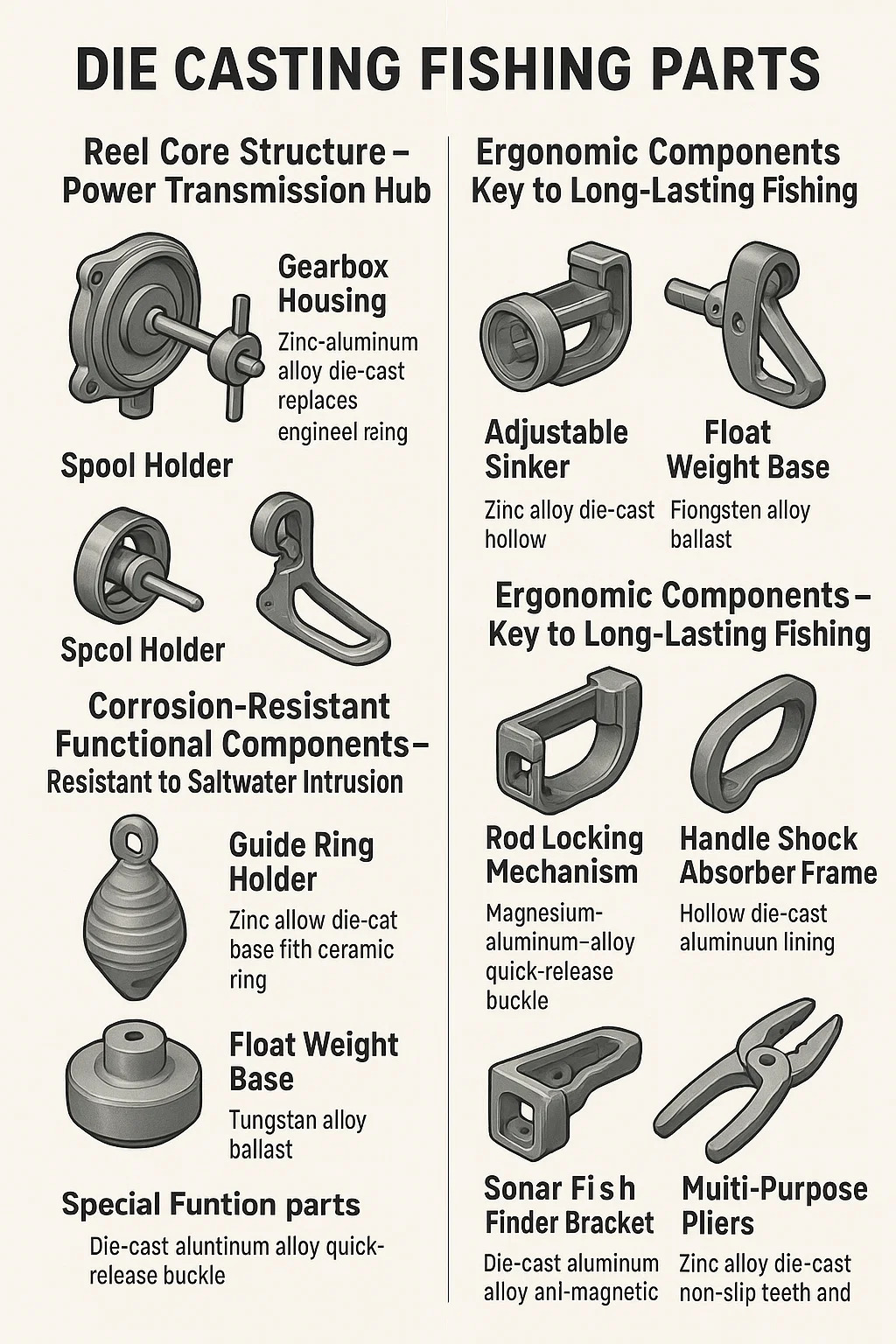 يموت أجزاء الصيد هي المكونات المعدنية الأساسية المصنعة باستخدام عملية صب عالية الضغط. يتناولون متطلبات معالجة الصيد الرئيسية مثل الخفيفة ، ومقاومة التآكل ، والموثوقية الوظيفية. التطبيقات والميزات الرئيسية هي كما يلي: