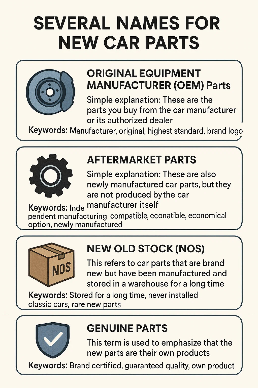العلامة التجارية الجديدة أجزاء السيارة لها العديد من الأسماء الشائعة، والتي تختلف قليلاً حسب مصدرها وطبيعتها.