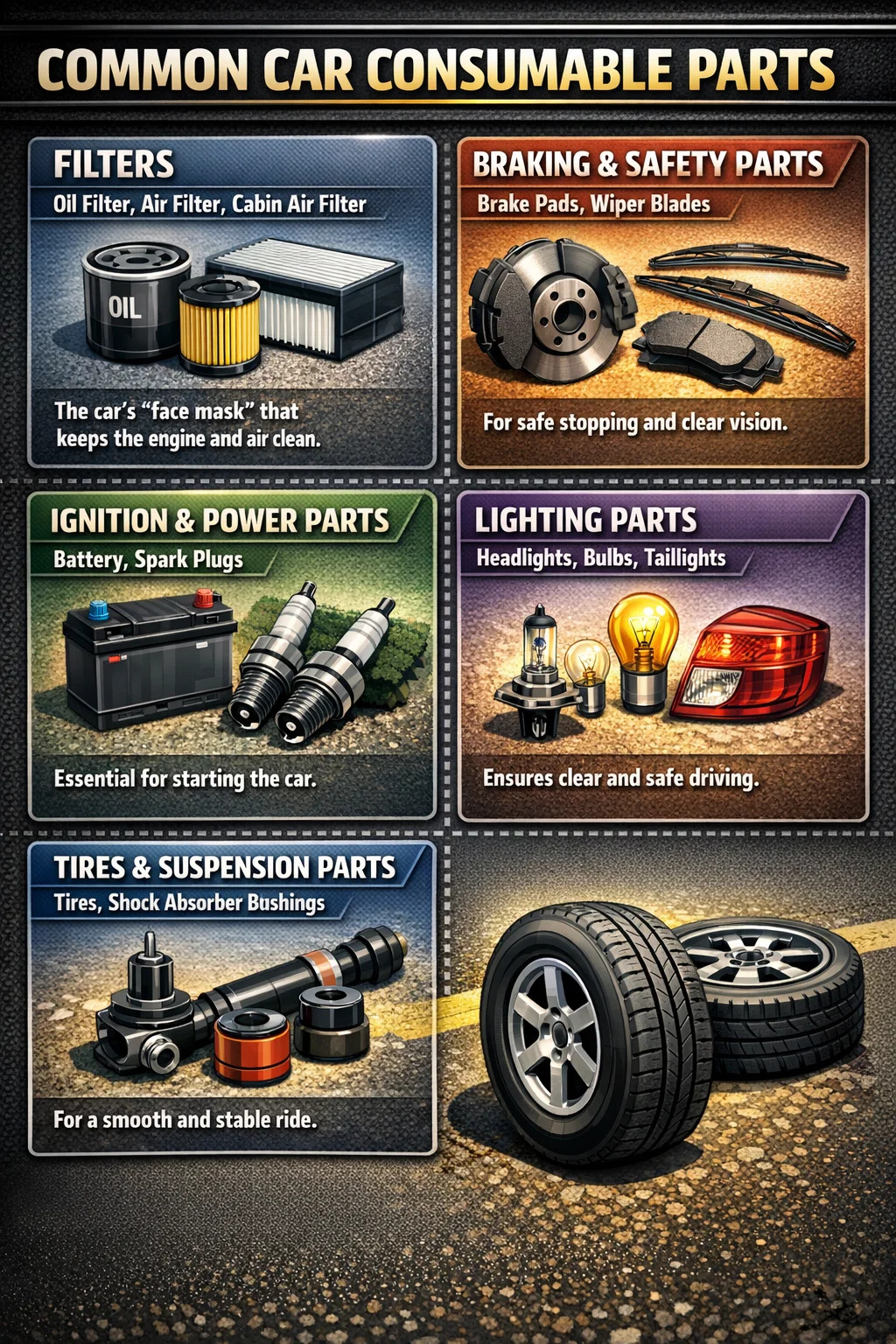 في عالم السيارات، تتآكل بعض الأجزاء بسرعة ويزداد الطلب عليها، مما يجعلها متاحة بسهولة في أي متجر لقطع غيار السيارات أو ورشة إصلاح. يُشار إلى أجزاء السيارة هذه عادةً باسم "الأجزاء المستهلكة" أو "الأجزاء شائعة الاستخدام".