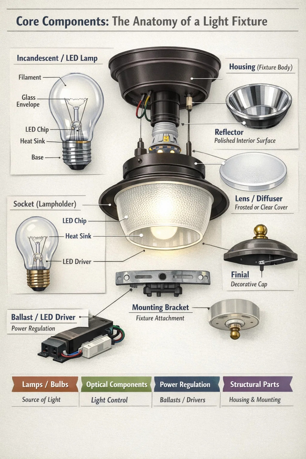 المكونات الأساسية: التشريح الأولي لتركيبات الإضاءة