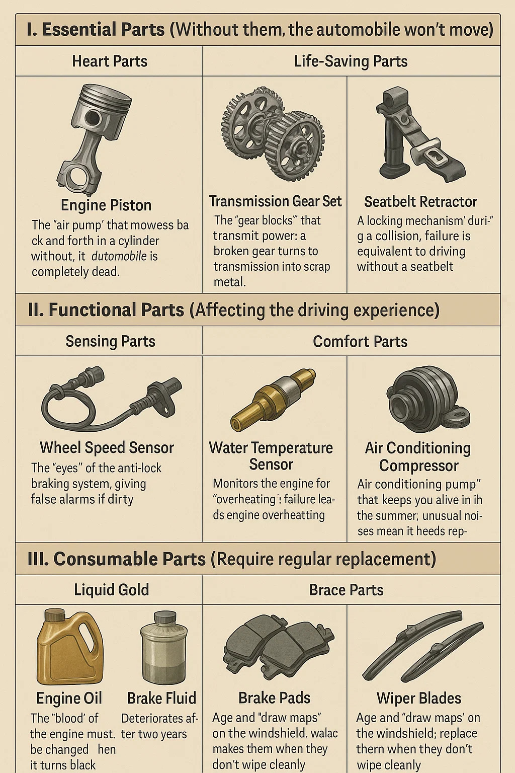 قطع غيار السيارات هي "الأعضاء" التي تشكل السيارة؛ إن فقدان جزء مهم يجعل السيارة غير صالحة للعمل، في حين أن الأجزاء الزخرفية الإضافية تجعلها أكثر بهرجة.