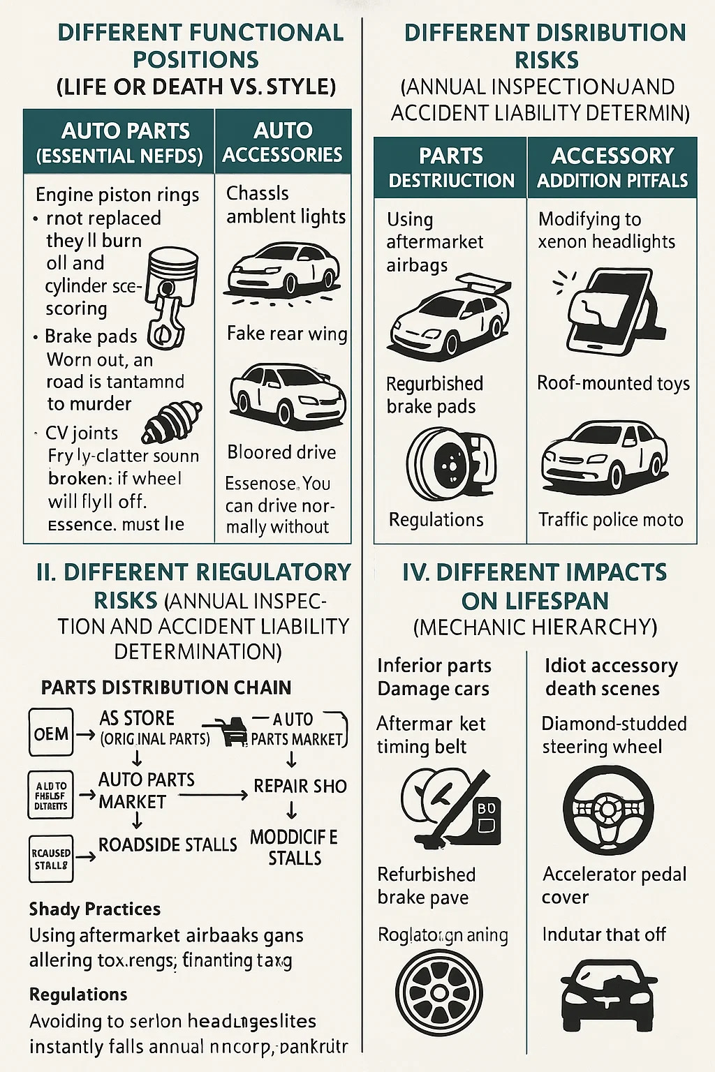 في نظر ورش تصليح السيارات وتعديلها، فإن الخط الفاصل هو "ما إذا كان من الممكن قيادة السيارة بدونها" و"ما إذا كانت شرطة المرور ستتحقق". فيما يلي معايير التمييز: