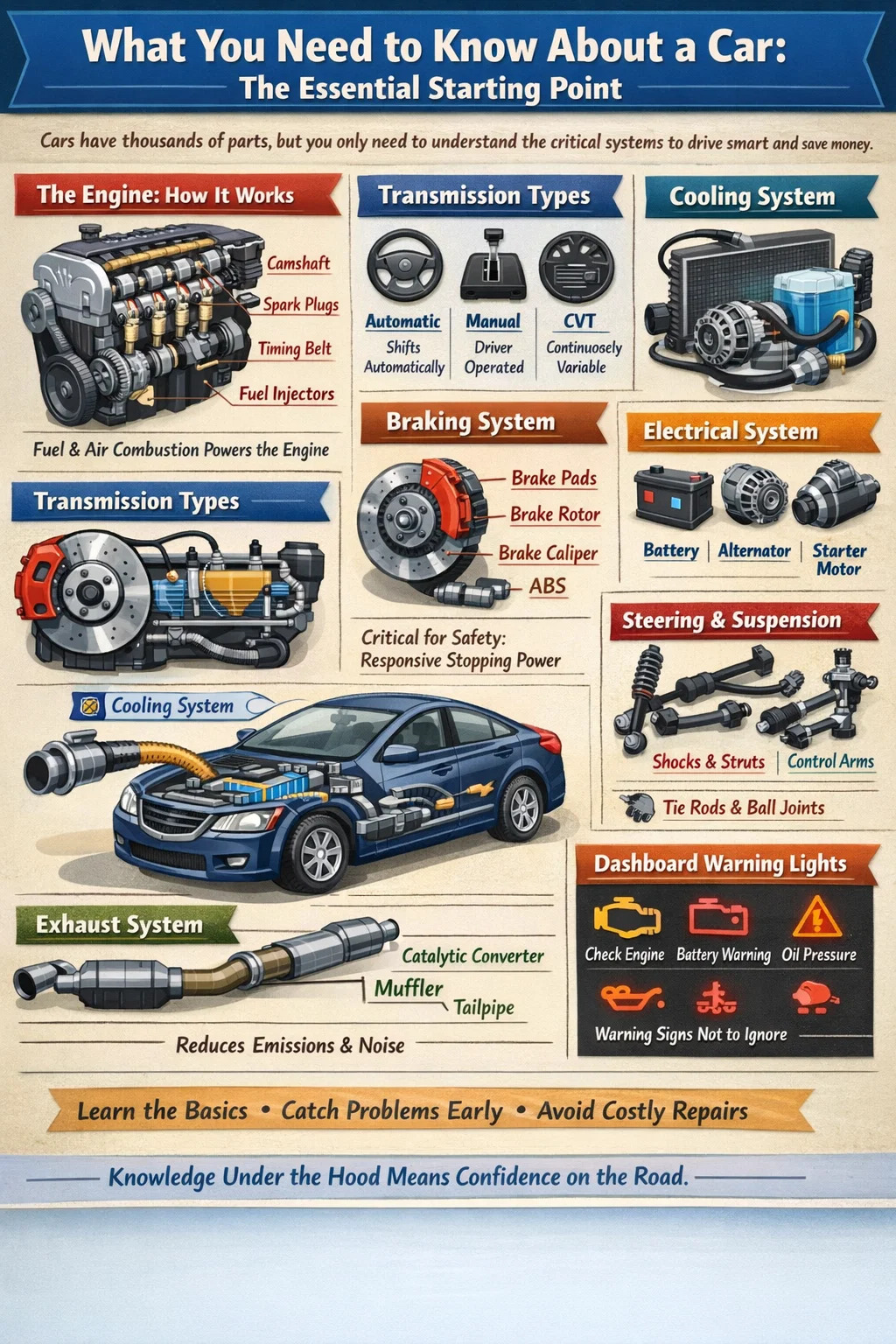 كل سيارة على الطريق هي عبارة عن مجموعة من الأنظمة المترابطة، ولا تحتاج إلى أن تكون ميكانيكيًا لفهمها. تحتوي السيارة النموذجية على ما يقرب من 30.000 قطعة فردية ، ولكن الغالبية العظمى من أصحاب السيارات لا يحتاجون إلا إلى فهم جزء صغير منهم للبقاء في أمان، وتوفير المال، واتخاذ قرارات مستنيرة في ورشة الإصلاح. يستعرض هذا الدليل أجزاء السيارة وأنظمتها التي تهم السائقين العاديين - بدءًا من ما يوجد أسفل غطاء المحرك إلى ما يحافظ على سلاسة رحلتك واستجابة الفرامل.